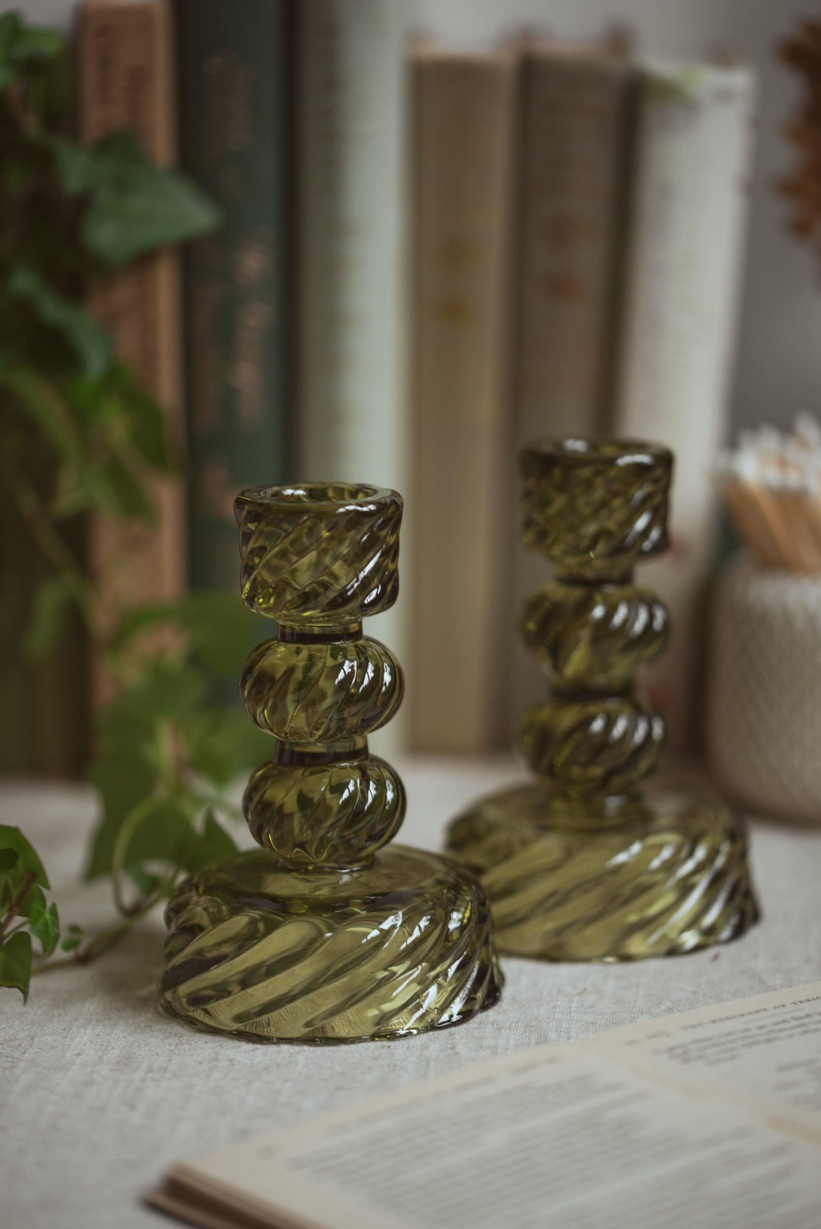 Green Twisted Glass Candlestick Set | Vintage-Inspired Candle Holders
